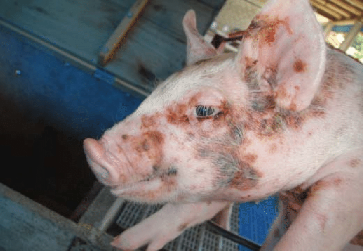 - A doença ocorre principalmente em leitões, onde apresentarão lesões no flanco e atrás das orelhas. A pele muda de coloração (castanho) pelo corpo todo e fica com aspecto de "pele gordurosa";